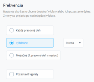 Predvolená frekvencia vyplácania ja nastavená na týždennú periódu. Túto periódu je možné podľa potreby zmeniť na dennú alebo mesačnú, prípadne je možné ju úplne pozastaviť.