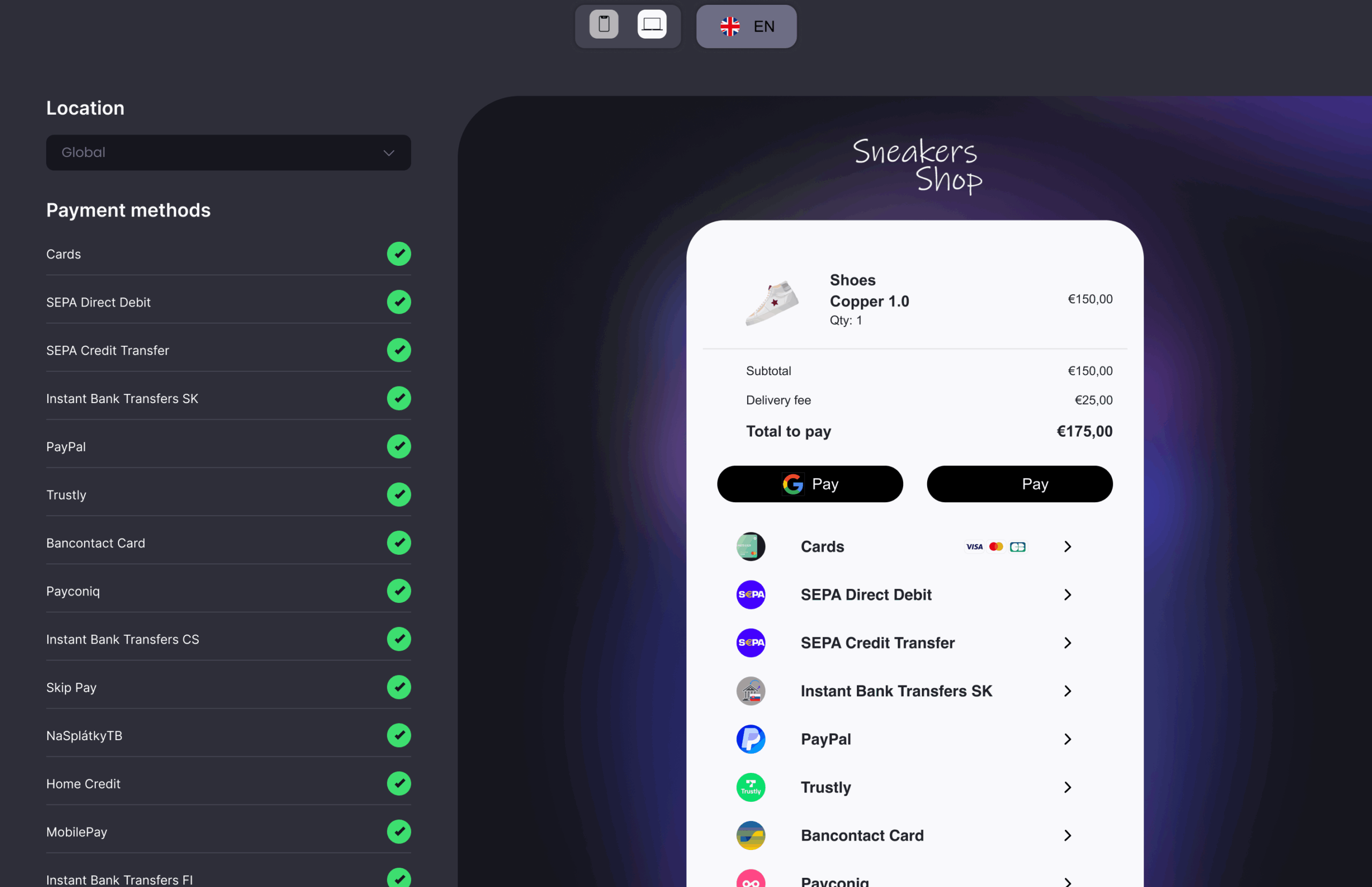 Prijímajte platby od miliardy držiteľov VISA a MasterCard, cez obľúbenú francúzsku kartovú schému Cartes Bancaires, alebo pohodlne s Apple Pay a Google Pay.