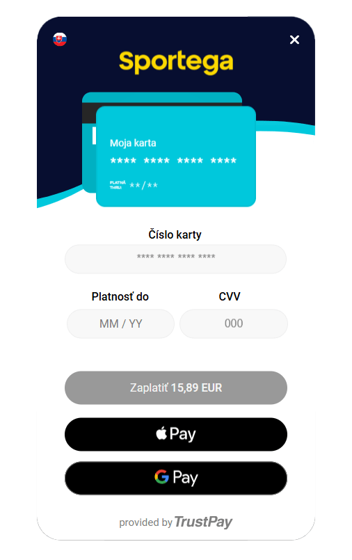 Zároveň majú zákazníci možnosť platiť kartami, ako aj prostredníctvom Google Pay a Apple Pay. Sportega patrí medzi inovátorov a to napríklad aj s nasadením Apple Pay platby cez QR kód na desktope, čím prináša svojím zákazníkom možnosť užiť si rýchlosť a pohodlie platby cez Apple Pay aj pri nakupovaní na desktope bez potreby siahať po karte.